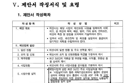 하지만 제안요청서 26페이지 제안서 작성서식 및 요령, 5번 사업수행 실적란을 살피면 '사업실적'에 대한 구체적인 정의를 파악할 수 있다. '사업실적이라 함은 위탁기관으로부터 콜센터 운영에 관해 위탁을 받아 콜센터 시스템 ASP 구축 및 상담인력을 투입하여 직접 운영한 실적'으로 납품실적 증명원을 필히 첨부케 했다.