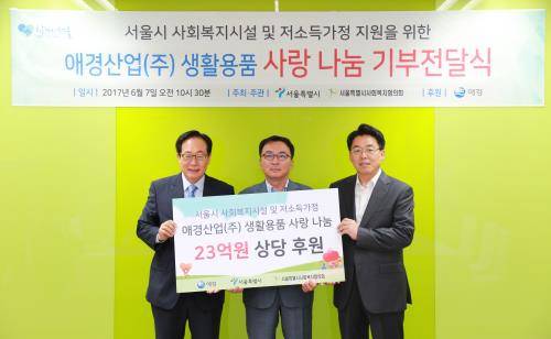 [프라임경제] 생활뷰티기업 애경(대표 고광현)은 7일 서울시청에서 서울특별시, 서울특별시사회복지협의회와 공동으로 저소득 소외계층 지원, 나눔문화 확산을 위한 '사랑 나눔 기부전달식'을 진행했다.