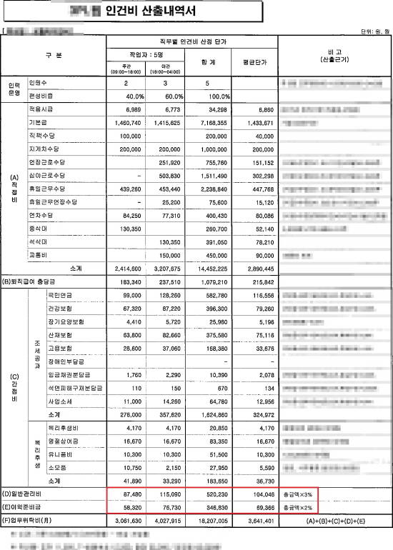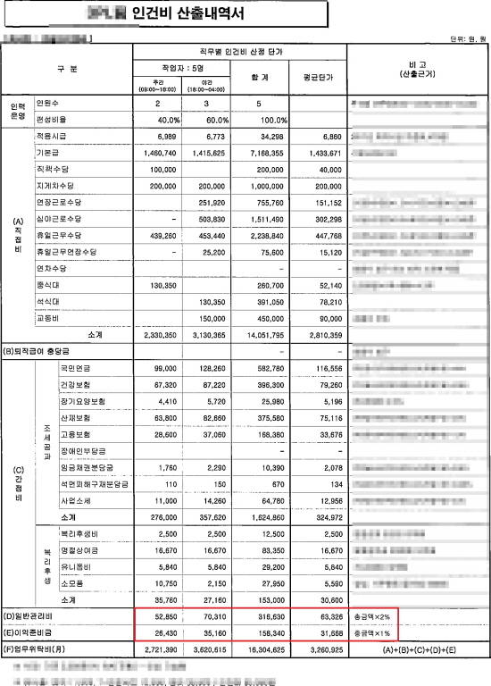 보통 아웃소싱 계약을 맺을 때 제출하는 서류 중 '위탁비 산출내역'을 살펴보면 직·간접 인건비와 제비용(복리후생·교육훈련·소모품·회의 및 포상)의 고정비용이 포함된다. 또 부가가치세(10%)와 일반관리비도 있다.