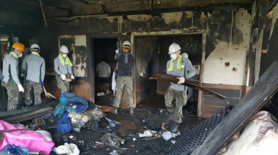 [프라임경제] 상무대 포병학교 교도대대 장병들이 화재로 인해 주택 내부가 전소된 피해가구를 찾아 복구 활동을 펼쳐 귀감이 되고 있다.