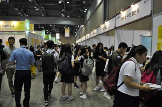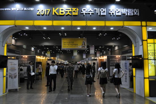 '2017 KB굿잡 우수기업 취업박람회'가 열린 경기도 일산 킨텍스(KINTEX)는 이날 오전부터 교복, 군복 등 제복을 입은 청년들로 발 디딜 틈 없이 붐볐다.
