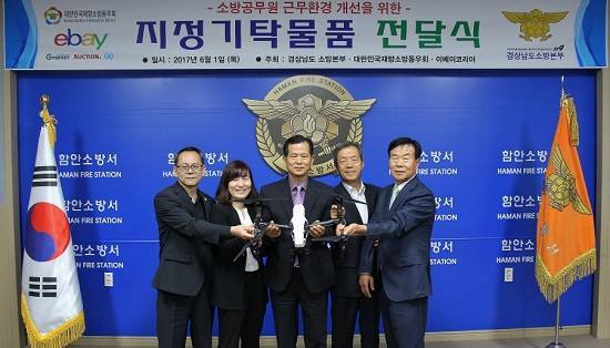 경상남도 함안소방서에 방문한 이베이코리아는 온도에 따라 색깔이 변해 어떤 것인지 알 수 있어 쫒아갈 수 있는 드론(사람이 안타는 작은 비행기)과 신발이 물에 젓었을 때 말려주는 신발건조기 등 소방관에게 필요한 물건들을 전해 주었어요.