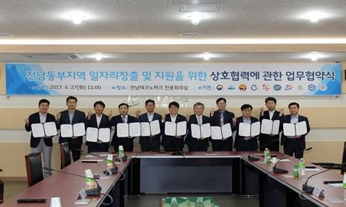 27일 전남테크노파크에서 가진 협약식은 순천시, 고용노동부 여수지청, 중소기업청 전남동부사무소, 여수시, 광양시, 중소기업진흥공단 전남동부지부, 한국산업인력공단 전남지사, 전남테크노파크, 순천대, 전남대 여수캠퍼스, 광양보건대학교 11개 기관이 참여했다.