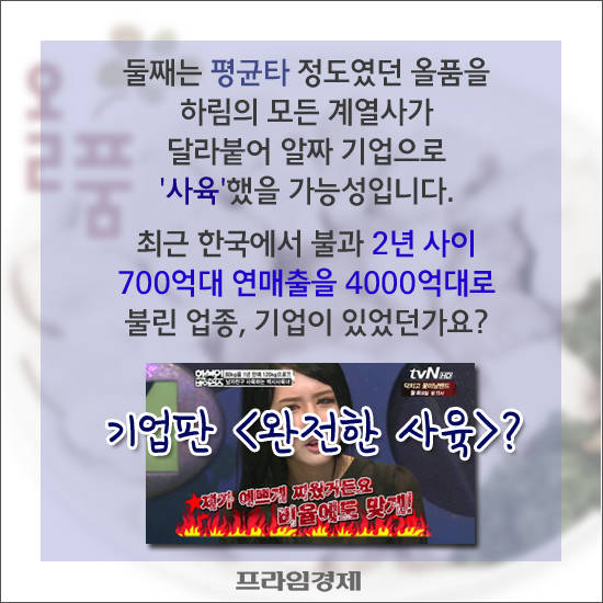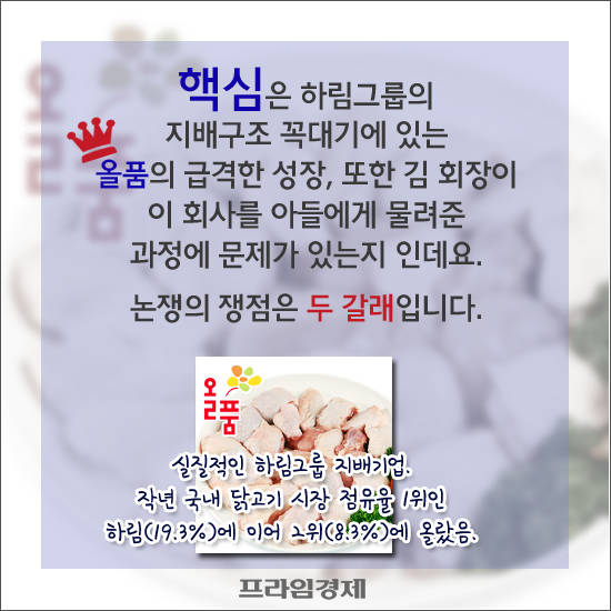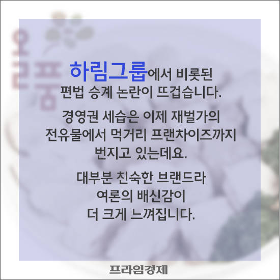 [프라임경제] 하림그룹에서 비롯된 편법승계 논란이 뜨겁다. 재벌가의 전유물이었던 경영권 세습을 둘러싼 꼼수 시비가 이제는 먹거리 프랜차이즈까지 전방위로 번지는 분위기다. 또한 동네에서 흔히 만나던 친숙한 브랜드 일색인지라 여론의 배신감은 더 크다.
