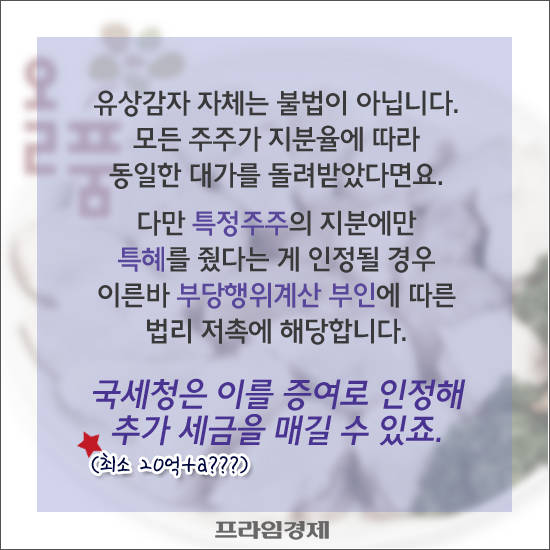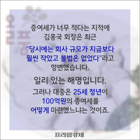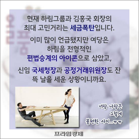 현재까지 하림그룹과 김홍국 회장의 불법 정황은 드러난 게 없지만, 적어도 세금폭탄은 각오해야 될 것이라는 얘기가 업계 안팎에서 들린다. 수차례 언급됐던 만큼 여당은 하림그룹을 '편법 승계의 아이콘'으로 삼았고, 신임 사령탑을 맞은 국세청과 공정거래위원회도 잔뜩 날을 세운 상황인 탓이다.