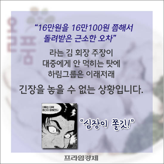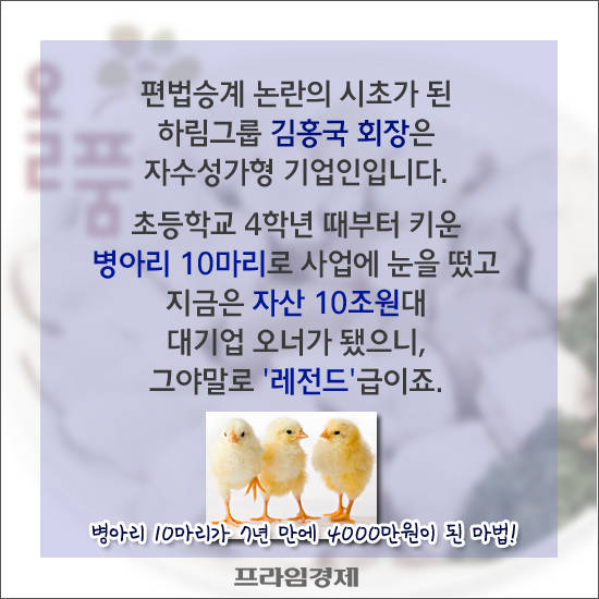 하림그룹은 김홍국 회장의 자수성가 스토리로 유명한 업체였다. 초등학교 4학년 때 키우기 시작한 병아리 10마리로 사업에 눈을 떴고 지금은 자산 10조원대 대기업 오너가 된 김 회장은 살아있는 전설로 여겨졌다.