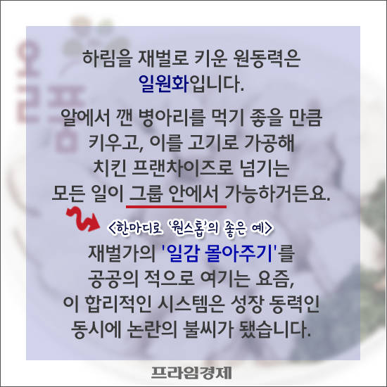 하림을 재벌로 키운 원동력은 일원화다. 알에서 깬 병아리를 먹기 좋을 만큼 키우고, 이를 고기로 가공해 치킨 프랜차이즈로 넘기는 모든 과정이 하림그룹 안에서 가능하기 때문이다. 재벌가의 '일감 몰아주기'(내부거래)를 공공의 적으로 여기는 요즘, 이 합리적인 시스템은 성장 동력인 동시에 논란의 불씨가 되고 있다.