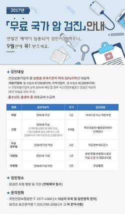국가 암 검진대상자는 의료급여수급권자 및 건강보험 가입자 중 2016년 11월 기준 직장 8만9000원 지역 9만원 이하 납부자가 해당되며, 암 검진 비용은 무료다. 건강보험납부액 상위 50% 대상자는 본인부담 10%만 부담하면 된다.
