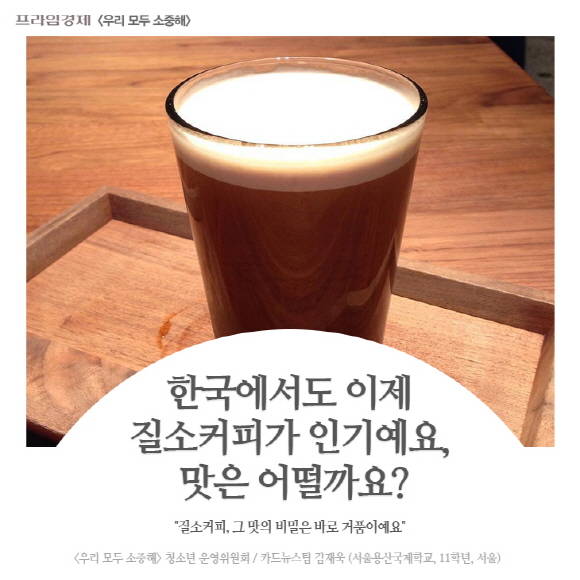 [프라임경제] '우리 모두 소중해' 캠페인의 재능기부 편집위원으로 참여하는 청소년 학생들은 발달장애인들의 감수를 거친 [우리모두뉴스] 기사를 [카드뉴스]로도 제작합니다. 이번에는 서울용산국제학교 11학년 김재욱 학생이 "한국에서도 이제 질소커피가 인기예요, 맛은 어떨까요?" 기사를 카드뉴스로 제작했습니다.