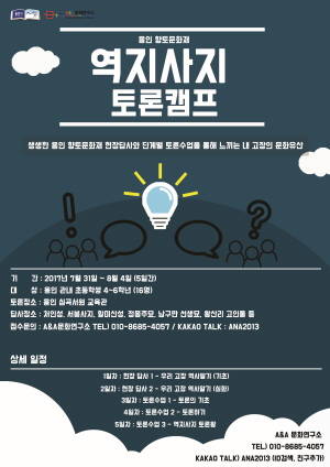 토론주제는 △역사적 인물의 입장을 바꾸어 보는 역지사지 토론 △용인의 최고 문화재를 선정하는 피라미드 토론 △문화재 발굴과 아파트 개발의 우선순위를 논하는 찬반 토론 등이다. 또 문화재 광고 만들기를 통해 우리 고장 최고의 문화재를 선정하는 시간도 갖는다.