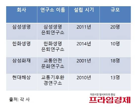 23일 업계에 따르면 삼성생명과 한화생명은 은퇴연구소를 꾸렸다. 손해보험사 중에서는 삼성화재, 현대해상이 교통 관련 연구소를 운영한다.