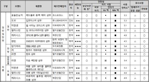 세정성능은 '댕기머리(명품스페셜 샴푸)' '팬틴(프로브이 아쿠아퓨어 샴푸)' 2개 제품이 피지와 먼지 등 오염을 제거하는 세정성능이 상대적으로 우수했다.