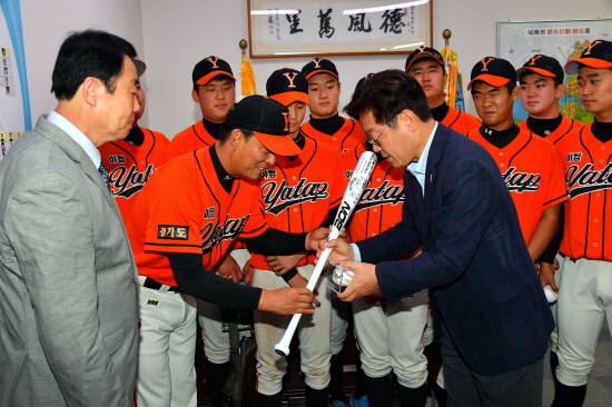 이 시장은 선수단에 친필 사인볼을 선물했고 선수단은 이 시장에게 실제 경기에서 사용했던 배트를 선물하는 등 시종일관 화기애애한 분위기를 이어갔다.