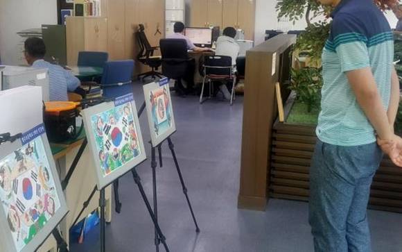 군인 아저씨들이 진행했던 '2015 나라사랑 태극기 그림 그리기 대회'에서 잘 그린 그림 15점을 골라 칠북면사무소 안에 걸어놓았어요.