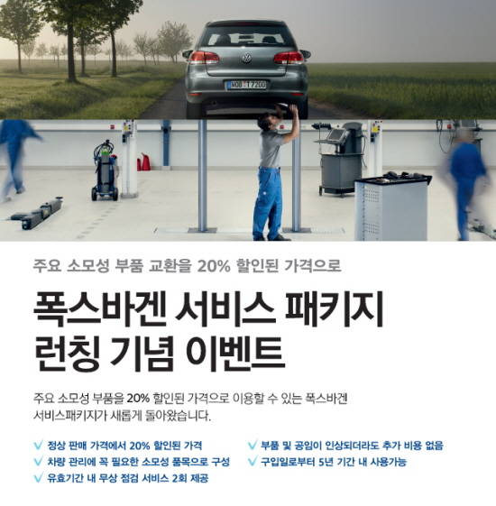 폭스바겐 서비스 패키지는 고객이 차량 관리 비용을 최소화하고 최적의 상태로 운행할 수 있도록 지원하기 위해 마련됐다. 차량운행에 있어 꼭 필요한 소모성 부품들로 구성됐으며, 패키지 구입에는 위 케어 캠페인(WCC) 바우처 사용이 가능하다.