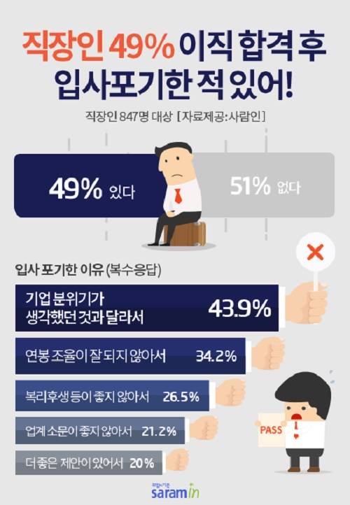 임민욱 사람인 팀장은 "이직 합격 후에도 기업문화나 연봉 등의 조건에 만족하지 못해 입사를 포기하는 경력 구직자들이 많다. 하지만 이들 중 절반 넘게는 그 선택을 후회하고 있는 것으로 나타났다"고 말했다.