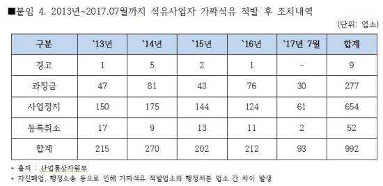 아울러 같은 기간 전국주유소 가운데 가짜석유를 팔다 적발된 곳도 735곳에 이른다. 이 가운데 2회 이상 적발된 주유소는 105곳으로 파악됐으며 한 주유소는 5회 이상 적발됐다는 설명이다.