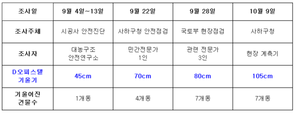 한편 국토교통부는 지난달 28일 현장점검을 통해 기울어진 이 건물에 2개의 계측기를 설치했다. 건설기술진흥법 제54조에 근거, 부산지방국토청을 통해 추석 직전부터 이달 중순까지 인근 9개 공사현장에 대한 현장점검을 진행 중에 있다.