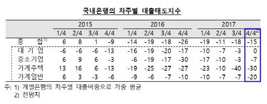 한국은행이 12일 발표한 '금융기관 대출행태 서베이' 결과에 따르면 올해 4분기 대출태도 지수는 마이너스(-) 15를 기록했다.