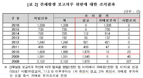지난 2009년 산재은폐에 대해 형벌로 처벌하던 종전의 규정을 개정해 과태료로 전환한 이후 2010년 1908건의 은폐 중 경고조치가 1875건, 과태료 부과가 10건, 사법조치가 23건이었는데, 2011년 이후부터는 과태료 부과 건수가 크게 늘어났으며 산재은폐에 따른 사법조치 건수는 없었다.