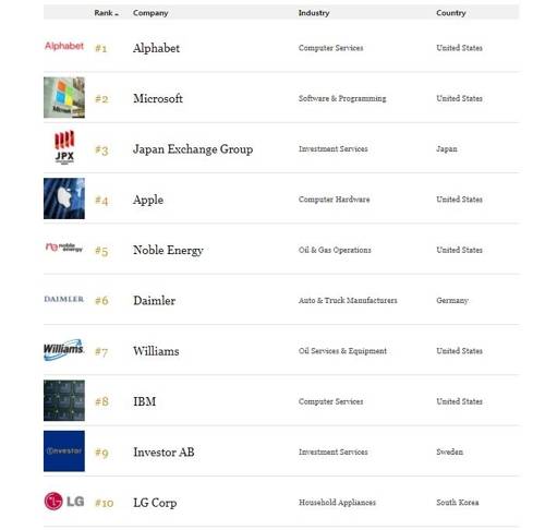 2위는 미국 소프트웨어(SW) 기업 마이크로소프트(MS)가 차지했으며, 일본거래소그룹(JPX), 미국 애플, 미국 노블에너지가 3~5위를 차지했다.