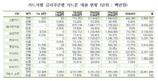 20% 이상의 고금리 대출을 가장 많이 하는 카드사는 △삼성카드 17%(7107억원) △현대카드 13%(4389억원) △우리카드 11%(2377억원) 등이었다. 특히 삼성카드에서 발생한 20% 이상 고금리 대출은 카드사 전체에서 발생한 것보다 1.8배 높았다.