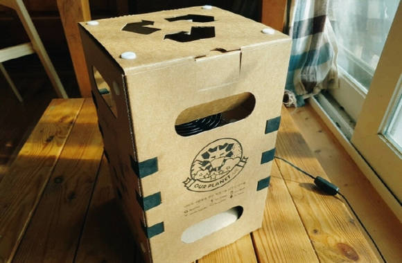 '적정기술 공기청정기'라는 이름의 이 공기청정기는 재활용 되는 종이 느낌의 몸통과 나쁜공기를 빠져 나가게 하는 장치, 나쁜 공기가 통과하면서 좋은 공기만 남게 도와주는 2개로 된 필터와 통으로 구성돼어 있어요.
