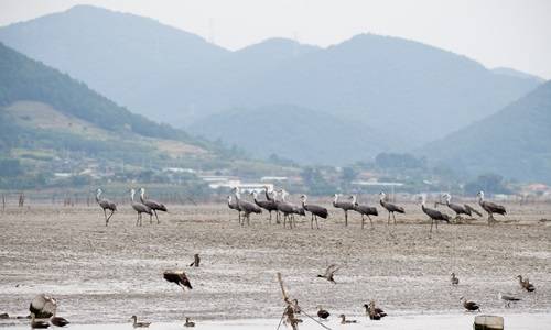 순천만 갯벌에 안착한 흑두루미 가족은 인적이 드문 갈대군락과 갯벌 사이에서 휴식을 취하고 있다. 흑두루미 도래 소식에 추수를 서두르던 흑두루미영농단은 흑두루미 희망농업단지(59ha) 추수를 20일까지 마무리할 계획이다.