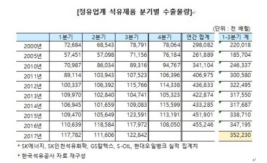 [프라임경제] 대한석유협회(이하 석유협회)는 △SK에너지 △GS칼텍스 △S-OIL(010950) △현대오일뱅크 등 국내 정유업계가 3분기까지 수출한 누적 석유제품이 3억5223배럴을 기록해, 역대 최고치였던 지난해(3억4719만5000배럴)보다 1.5% 증가했다고 26일 밝혔다.