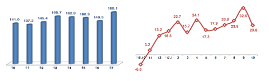 전년 동월 대비 ICT 수출 증가율은 4월 24.1%, 5월 17.3%, 6월 17.9%, 7월 20.8%, 8월 23.8%, 9월 32.6% 등 약 1년간 두 자릿수를 유지하고 있다.