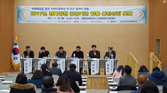 [프라임경제] 경북 김천시 혁신도시 이전 공공기관을 중심으로 산학연 협업체계를 마련해 동반성장과 상생문화 시너지 효과 창출을 위한 '2017년 경북김천 공공기관 합동 동반성장 포럼'이 20일 경북혁신도시 '산학연유치지원센터'에서 열렸다.