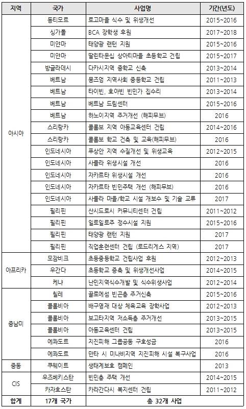 카자흐스탄 카라간다시 교육센터 건립을 시작으로 2016년 스리랑카 아동교육센터 건립, 동티모르 식수‧위생개선사업 등 총 17개 국가에서 32개 사업을 진행해 오고 있다.