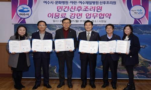 여수시는 지난 27일 시장실에서 아란·문화병원·제일병원 등 3개 산후조리원 대표와 이용료 감면 업무협약을 체결했다고 30일 밝혔다. 협약내용은 여수시에 주민등록을 두고 세 자녀 이상을 출산한 산모에 산후조리원 요금의 20%를 감면하는 것이다.