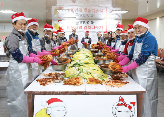 한편, 금호타이어는 이웃과 함께하는 따뜻한 지역사회를 만들기 위해 매년 설과 추석에는 임직원들과 함께 사업장 인근에서 거주하는 독거노인과 소외계층을 위해 제수용품과 식료품을 전달하고, 연말에는 김장김치를 직접 담궈서 전달하고 있다.
