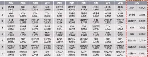'미디어 맏형'으로 자리매김해온 KBS와 MBC는 신뢰·공정·유용 전 부문에서 2017년 8대 미디어에 속하지 못하고 불명예를 얻었다.