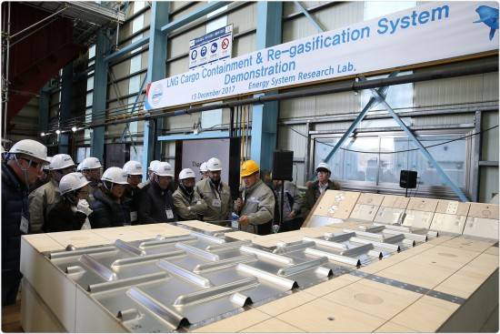 [프라임경제] 대우조선해양(042660, 이하 대우조선)은 옥포조선소 내 에너지시스템 실험센터에서 자체 개발한 간접 열교환식 재기화 장치와 액화천연가스(이하 LNG) 화물창 '솔리더스' 및 '맥티브' 시연회를 성공적으로 개최했다고 18일 밝혔다.