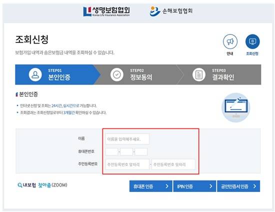 확인방법은 '내보험 찾아줌(Zoom)' 홈페이지에 접속하거나, 생명보험협회, 손해보험협회 및 금융감독원 '파인' 홈페이지 등에서도 조회가 가능하다. 주민등록번호, 이름, 휴대전화(본인명의) 등을 입력하고 휴대폰인증 등 간단한 본인인증 절차를 거치면 확인할 수 있다.