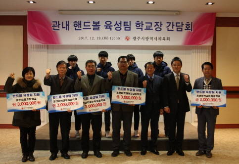 광주시체육회는 19일 12시 프라도호텔에서 '핸드볼 육성팀 학교장 간담회'를 갖고 관내 핸드볼 육성학교인 조선대부속고등학교 등 6개 초·중·고등학교 선수단에 훈련지원금과 동계 피복을 전달했다.