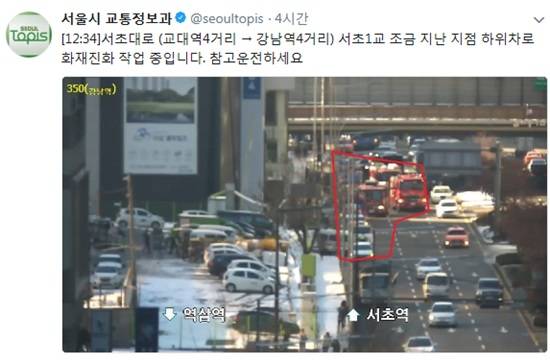 교통정보과는 트위터를 통해 "서초대로 (교대역 사거리 → 강남역 사거리) 서초 1교를 조금 지난 지점 하위차로 화재 진화 작업 중입니다. 참고 운전하세요"라며 현장 상황을 전했다.