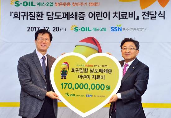 [프라임경제] S-OIL(010950, 이하 에쓰오일)은 20일 서울 마포구 본사에서 희귀질환 담도폐쇄증 어린이 치료비 전달식을 열고 한국사회복지협의회에 치료비 1억7000만원을 전달했다고 밝혔다.