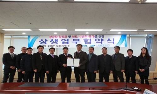20일 광양항 월드마린센터 대회의실에서 한국철도공사(사장 직무대행 유재영, 이하 철도공사)와 가진 업무협약은 광양항 서측철송장(신광양항역) 운영 효율화와 광양항 철도화물 수송을 증대시키는데 그 목적이 있다고 항만공사 측은 밝혔다.