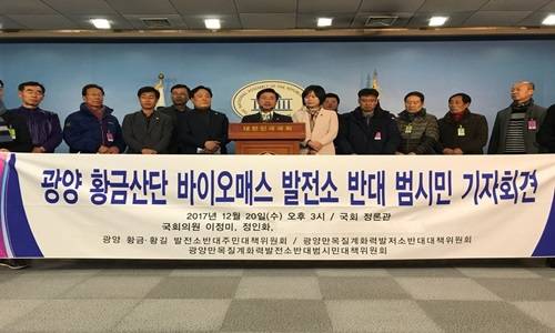 위원회는 20일 국회 정론관에서 성명을 통해 "광양그린에너지가 추진하는 화력발전소는 14만3000여㎡의 부지에 220MW급으로 건립될 계획이지만 그 동안 환경영향평가 공청회가 세 차례 열렸으나 시민들의 강력한 반발로 모두 무산되는 등 지역의 반대가 확산되고 있다"고 밝혔다.