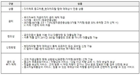 현대캐피탈 협약 매매상사를 이용하는 고객은 12개월 무이자, 36개월/48개월은 최저 3.9%의 금리로 중고차 금융을 이용할 수 있다. 신청 방법도 간단하다. 현대캐피탈 협약 매매상사를 통해 오프라인 또는 모바일(URL 접속)로 간편하게 금융을 신청할 수 있으며, 공인인증서를 활용하여 15분 이내 대출약정 및 실행까지 완료할 수 있다. 365일 24시간 서류 제출 없이 대출한도 조회 뿐 아니라 대출 실행까지 가능한 시스템을 제공하고, 고객의 자금상황에 따라 표준형, 거치형, 유예형 등 상환방식을 선택할 수 있다. 이 외 차량에 문제가 있을 경우 ‘중고차 무료보장 서비스’와 ‘차량교체 보상서비스’를 제공해 중고차 이용 고객의 구매 부담을 최소화하고 있다.