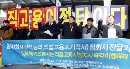 이런 가운데 파리바게뜨는 지난 1일 △파리바게뜨 본사 △협력업체 △가맹점주협의회 3자 합작법인인 '해피파트너즈' 설립을 발표, 제빵기사 70%가 합자회사에 고용되기를 원한다는 동의서를 제출했다. 제빵기사 70%로부터 직접고용거부 확인서를 받아낸 것.