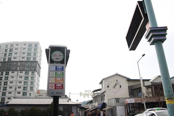 미세먼지 신호등은 오선동 삼성전자, 송정1동 주민센터에 있는 대기오염측정소에서 측정된 데이터 가운데 가까운 곳의 정보를 실시간 보여준다.