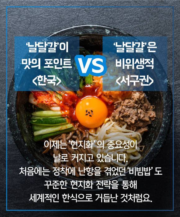 이와 반대로 재화나 서비스 등을 세계 공통으로 통일하는 것은 '글로벌화(Globalization)'라고 합니다. 그동안 해외시장 진출을 앞둔 기업이나 조직에서는 현지화와 글로벌화를 적절히 조율하는 전략을 펼치곤 했습니다. 그런데 요즘 들어서는 현지화의 중요성이 상대적으로 커지고 있는데요.