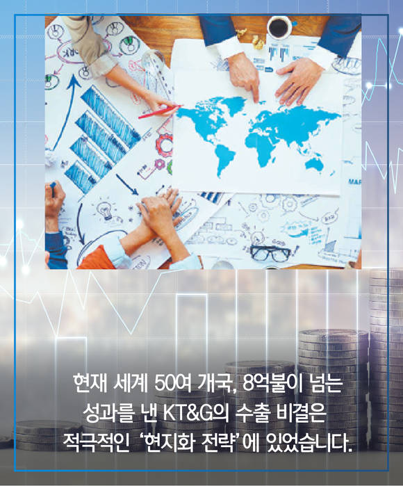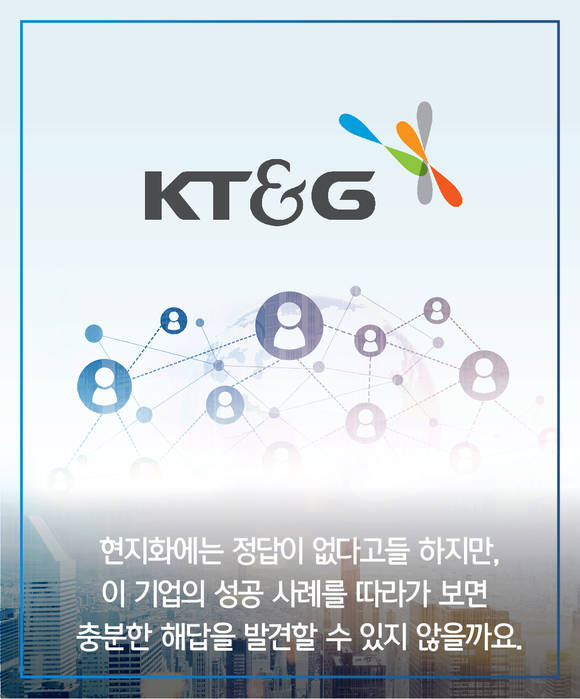 현지화에는 정답이 없다고들 하지만 특정 기업의 성공 사례를 따라가 보면 해답을 찾을 수 있지 않을까 홥니다. 현재 세계 50여 개국, 8억 달러 규모의 성과를 거둔 KT&G(033780)의 수출 비결은 적극적인 현지화 전략에 있으니까요.