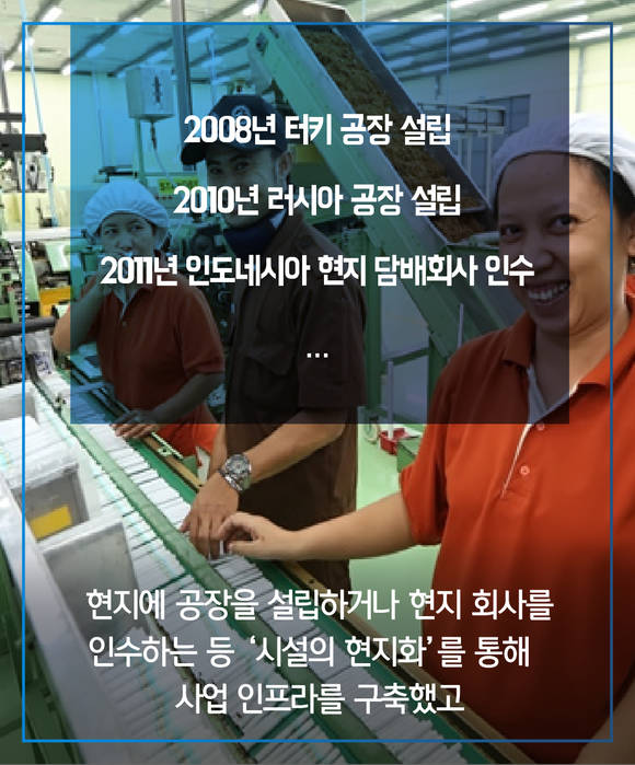 KT&G는 2008년 터키에 처음 공장을 설립한 이후 2010년 러시아 현지에 공장을 세우고 이듬해에는 인도네시아 담배회사를 인수하며 이른바 '시설의 현지화'를 통해 사업 인프라를 구축해왔습니다.