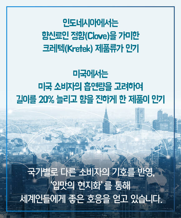 업체에 따르면 인도네시아에서는 향신료인 정향(Clove)을 가미한 크레텍(Kretek) 제품이 인기이고, 미국에서는 현지 소비자의 흡연스타일을 고려해 20% 더 길고 진한 향을 풍기는 제품이 인기라는데요. 나라마다 다른 소비자의 기호를 반영하는 ‘입맛의 현지화’를 통해 세계인들에게 좋은 호응을 얻고 있습니다.