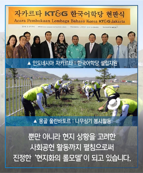 뿐만 아니라 현지 상황을 고려한 몽골 울란바토르 나무심기 봉사활동, 인도네시아 자카르타 한국어학당 설립지원 등의 사회공헌 활동까지 펼쳐 일종의 '롤모델'이 됐다는군요.
